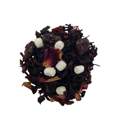 Christmas Magic is a bright, festive blend built around organic hibiscus and rosehips, creating a naturally tart, ruby-red base. Sweet raisins add gentle fruit warmth, while soft marshmallows bring light creaminess. Rose petals contribute a delicate floral accent, and natural flavors introduce a smooth plum note that enriches the cup with deep, jam-like sweetness. The result is a vibrant, comforting infusion with balanced tangy, fruity, and softly sweet elements for the holiday season.